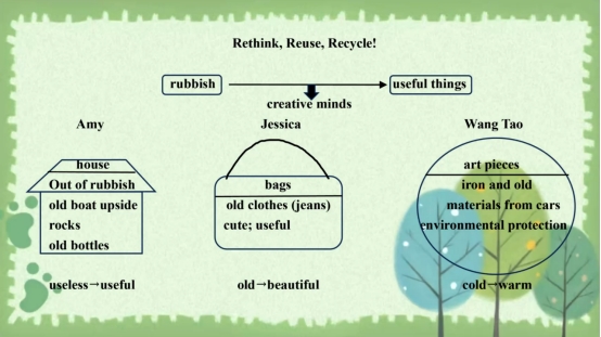 小组成员丁茜同学称赞李贝同学的授课具有高度完整性,师生互动积极,课堂开放度较高。表达流利,熟练运用指示性口语引导学生。课件创新新颖,与教材紧密结合。郑艾煌同学则认为,李贝同学此次授课思路清晰,环节紧凑,一步步的引导学生们掌握新的知识,充分的发挥了学生的积极性和主动性。姜良涵同学表示,李贝同学的课程设计富有创意且结构清晰。首先,她通过引入废塑料瓶的话题,激发学生参与讨论,培养环保意识。课堂活动包括快速阅读和预测文章内容,这有助于提高学生的阅读理解能力。其次,李贝同学还通过实例让学生理解废物再利用的重要性,并鼓励他们将所学应用到实际生活中。在教学过程中,她注重引导学生合作讨论,培养他们的团队协作和表达能力。最后,李贝同学还强调了正式词汇的前缀和后缀的使用,帮助学生深化对词汇结构的理解。总的来说,这是一堂实践性强、互动性高的英语课,有助于培养学生的实际操作能力和批判性思维。