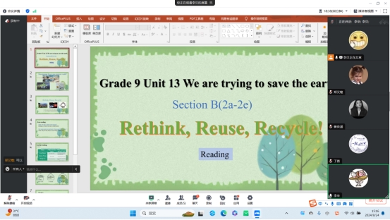 活动开始,李贝同学以人教版九年级全一册Unit 13 We are tring to save the earth中的SectionB(2a-2e)部分为授课内容,课型为阅读课。导入阶段,李贝同学采用图片的方式引导学生思考如何将废弃塑料瓶变废为宝,并引导学生根据图片对文章进行预测。在读中环节,分别设计了Fast reading和Careful reading两个活动引导学生探讨语篇内容。另外,对于语篇中所出现的前缀和后缀进行讲解,加深了学生对英语中前后缀的理解和应用。整篇文章帮助学生挖掘出了在语篇背后所传达的教育意义和主题意义——保护环境,从我做起。