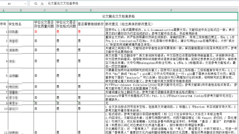 学院成立了以院长谈宏慧为组长,教学院长徐芳、英语系主任王娟、副主任张婷等为组员的自查工作小组,分三阶段推进:导师自查(6月13日-16日),指导教师逐项检查论文格式、内容及学术严谨性,督促学生修改;交叉互查(6月16日-19日),英语系匿名抽查34篇论文,包括英语师范生毕业论文,发现格式规范问题占比82.4%,内容质量问题占比26.5%,学术表达问题占比35.3%,学术规范问题占比20.6%;整改完善(6月19日-23日),导师指导学生优化论文,确保质量达标。